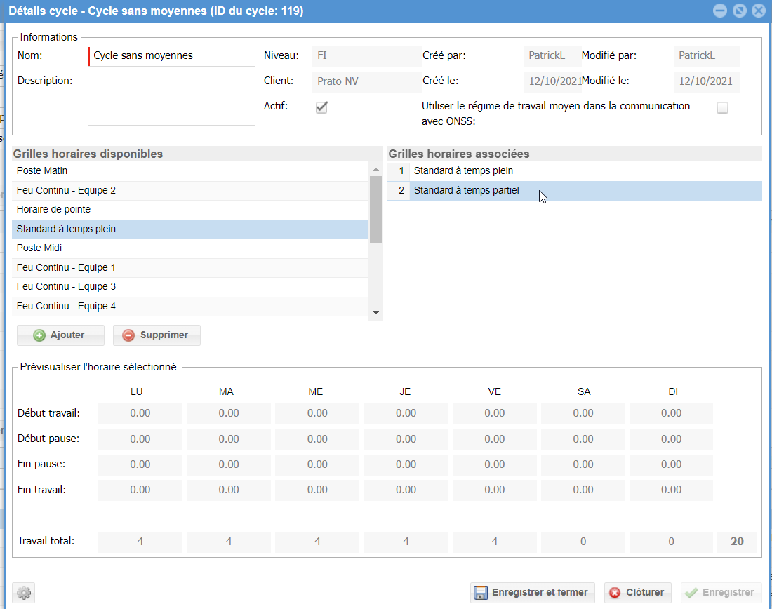 Wanneer “Gemiddeld werkregime gebruiken in communicatie met RSZ” wordt uitgevinkt en deze cyclus vervolgens wordt geselecteerd bij de opmaak van het contract zijn de gegevens zichtbaar als volgt: