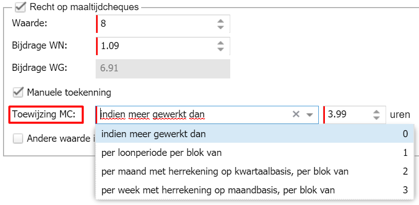 In een profiel kunnen de maaltijdcheques geautomatiseerd worden. Daarbij moet ook telkens aangeduid worden op welke manier de maaltijdcheques toegewezen moeten worden. Er zijn verschillende manieren om de maaltijdcheques te laten berekenen. Hieronder wordt uitgelegd wat de opties betekenen: