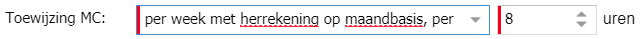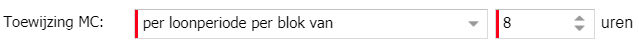| 'Per loonperiode per blok van' | Deze optie houdt rekening met het totaal aantal uren dat er gewerkt wordt binnen dezelfde loonperiode (dit kan per week of per maand zijn afhankelijk van het betaalsysteem dat wordt gebruikt voor de UZK'en). Dat totaal wordt dan gedeeld door het aantal uren dat ingegeven is in het profiel. Voorbeeld: In dit voorbeeld wordt het weektotaal gedeeld door 8. Stel dat er maar 4 dagen van 10u zijn gepresteerd door een UZK, zal hij toch 5 MC's ontvangen omdat hij 40u gewerkt heeft. Dit gedeeld door 8 = 5 MC's. |