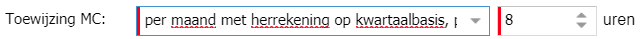 | 'Per maand met herrekening op kwartaalbasis, per blok van' | Deze optie werkt alleen als men het maandelijks betaalsysteem gebruikt in de prestatiemodule. Hiermee worden de totale uren per maand opgeteld en vervolgens gedeeld door het aantal uren dat ingegeven is in het profiel. Vervolgens zal er op het einde van elk kwartaal nog eens gekeken worden of er resturen zijn van de afgelopen 3 maanden. Als er dan nog voldoende resturen zijn, wordt er op het einde van het kwartaal nog één extra MC toegekend. Voorbeeld: