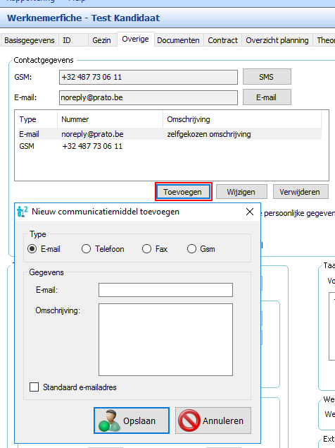 Door op de knop 'toevoegen' te klikken open je de grid. Langs hier is het mogelijk om een e-mailadres, telefoon-, fax- of gsmnummer toe te voegen, afhankelijk van de gekozen optie.