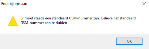 Wanneer er geen standaard nummer of standaard e-mailadres is gekozen en je probeert het ingegeven nummer of e-mailadres op te slaan, geeft het systeem een melding: