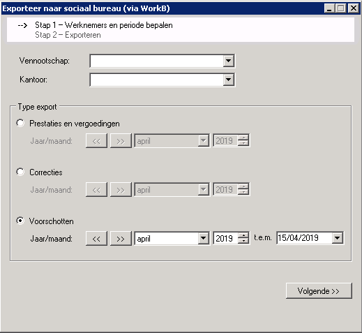 Om alles te centraliseren kan je vanaf heden de voorschotten (vast en berekend voorschot) terug vinden onder het menu ‘extra - export naar sociaal bureau’.