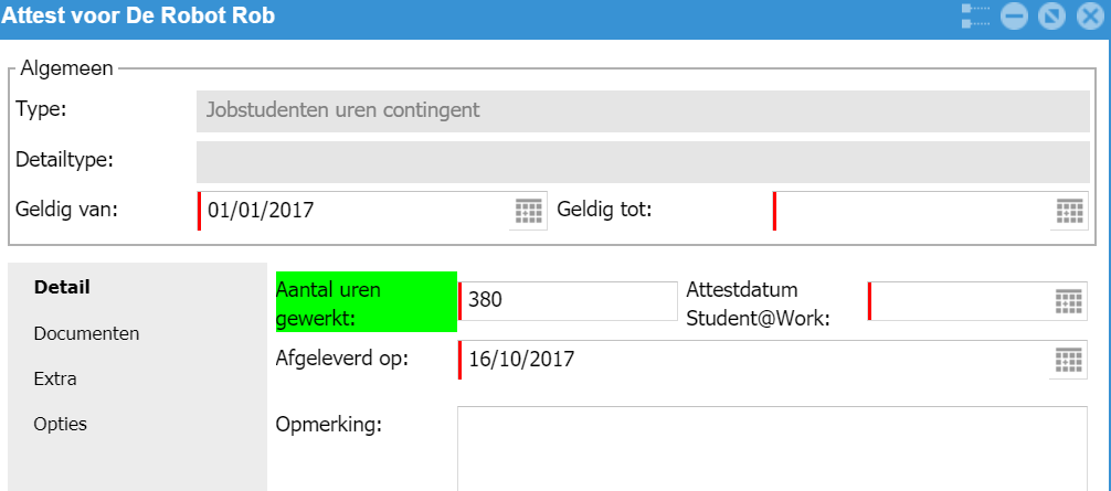 In PratoFlex moet er voor een student altijd een attest van het type 'Jobstudenten uren contingent' worden toegevoegd in de personenfiche om deze student onder contract te kunnen zetten. Op dit attest kan het aantal uren ingevuld worden die de student al reeds gewerkt heeft gedurende het huidige kalenderjaar in het veld 'Aantal uren gewerkt'. Dit kan dus maximaal maar 475u/600u (2023-2024) bevatten.