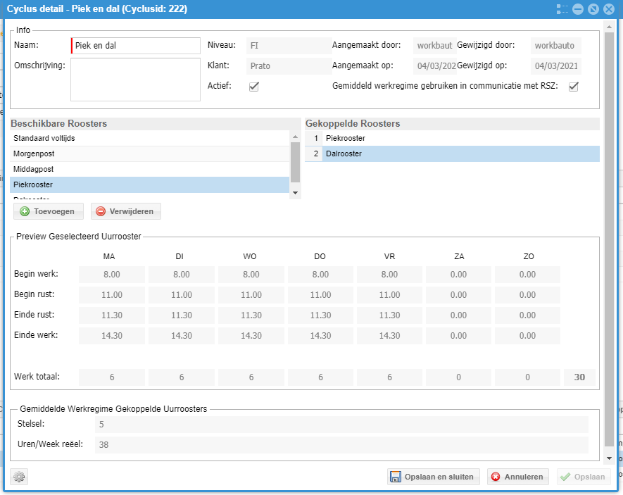 Je kan roosters uit “Beschikbare roosters” slepen naar “Gekoppelde roosters”. Wanneer je dit doet zal je zien dat het gemiddeld werkregime (9) wordt bijgewerkt. Je kan een gekoppeld rooster ook weer terug slepen naar “Beschikbare roosters” om deze te verwijderen uit de cyclus.